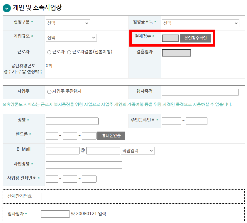 3. 개인 및 소속사업장 정보를 입력한 후 점수를 확인합니다.