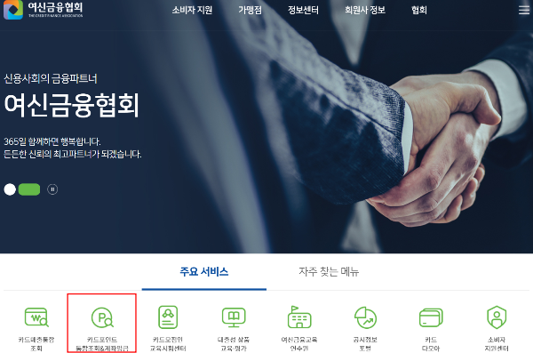 1. 여신금융협회 홈페이지 접속하여 카드포인트 통합조회&계좌입금 버튼을 클릭합니다.