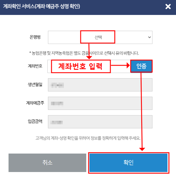 ▶ 본인명의의 계좌가 맞고 은행명과 계좌번호가 틀리지 않았는데 계좌인증 실패라고 팝업창이 뜨는 경우가 있습니다.