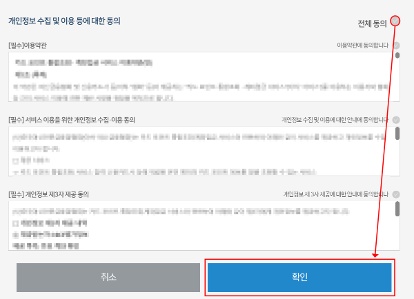 4. 개인정보 수집 및 이용 등에 대한 동의를 전체 동의해줍니다.
