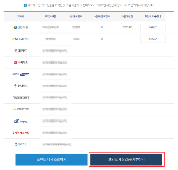 계좌입금 금액을 다시 포인트로 전환하고자 하실 경우, 각 카드사에 문의하셔야 합니다.